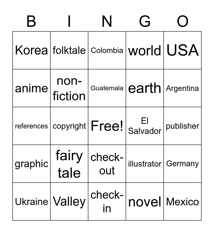 This bingo card has a free space and 60 words: Sandy, Valley, library, graphic, novel, fiction, non-fiction, ocean, earth, stories, world, one, anime, manga, Japan, Korea, Mexico, USA, Canada, Guatemala, El Salvador, Colombia, Ukraine, Germany, Italy, Britain, Ireland, Brazil, Argentina, Australia, Destiny, e-book, mystery, myth, folktale, Dewey, plagiarism, copyright, cite, references, fantasy, fairy tale, publisher, author, illustrator, book, biography, poetry, due date, check-out, check-in, explore, travel, culture, language, tour, passport, custom, tradition and heritage.