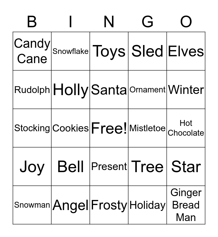 This bingo card has a free space and 24 words: Bell, Angel, Santa, Snowman, Elves, Candy Cane, Rudolph, Snowflake, Mistletoe, Present, Ornament, Stocking, Tree, Star, Holly, Holiday, Hot Chocolate, Toys, Winter, Cookies, Ginger Bread Man, Joy, Sled and Frosty.