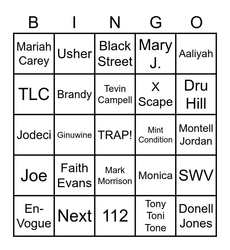 This bingo card has a free space and 24 words: Faith Evans, Next, Tevin Campell, En-Vogue, Aaliyah, Mariah Carey, TLC, Usher, Mint Condition, Mark Morrison, X Scape, Jodeci, Monica, SWV, Brandy, Tony Toni Tone, Montell Jordan, Black Street, Dru Hill, Ginuwine, Donell Jones, Joe, Mary J. and 112.