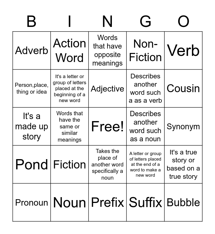 This bingo card has a free space and 24 words: Fiction, Noun, Adjective, Pronoun, Verb, Adverb, Person,place, thing or idea, Action Word, Describes another word such as a noun, Takes the place of another word specifically a noun, Describes another word such a as a verb, It's a made up story, A letter or group of letters placed at the end of a word to make a new word, It's a true story or based on a true story, It's a letter or group of letters placed at the beginning of a new word, Suffix, Synonym, Words that have opposite meanings, Cousin, Words that have the same or similar meanings, Bubble, Pond, Non-Fiction and Prefix.