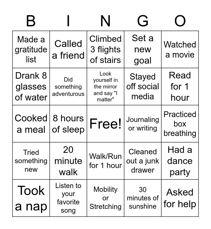 This bingo card has a free space and 24 words: 20 minute walk, Listen to your favorite song, Look yourself in the mirror and say "I matter", Took a nap, Watched a movie, Made a gratitude list, Drank 8 glasses of water, Called a friend, Journaling or writing, Walk/Run for 1 hour, Stayed off social media, Cooked a meal, Cleaned out a junk drawer, Had a dance party, Did something adventurous, 30 minutes of sunshine, Practiced box breathing, Climbed 3 flights of stairs, Read for 1 hour, 8 hours of sleep, Asked for help, Tried something new, Set a new goal and Mobility or Stretching.