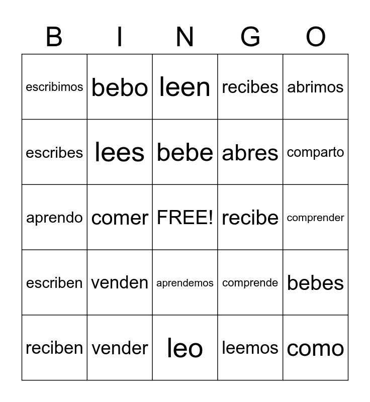 This bingo card has a free space and 51 words: comprendes, como, escribo, leo, venden, recibo, bebo, comes, escribes, comprendo, lees, recibes, bebes, comprende, come, escribe, bebe, recibe, lee, abrimos, comer, leemos, escribimos, abres, vendo, recibimos, comparto, comen, reciben, leen, beben, bebemos, comparten, comprendemos, leer, vender, beber, compartir, escribir, recibir, comprender, escriben, abrir, abren, comemos, aprender, aprendo, aprendes, aprende, aprendemos and aprenden.
