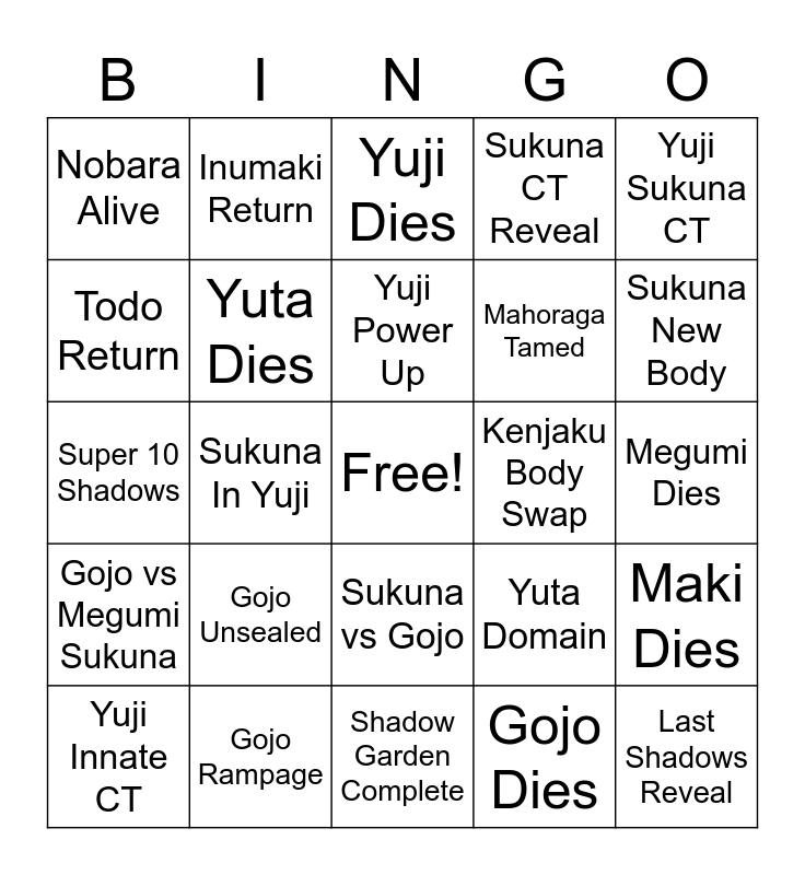 This bingo card has a free space and 24 words: Gojo Unsealed, Gojo Rampage, Yuji Power Up, Yuji Innate CT, Yuji Sukuna CT, Nobara Alive, Todo Return, Inumaki Return, Kenjaku Body Swap, Sukuna vs Gojo, Mahoraga Tamed, Super 10 Shadows, Yuta Domain, Maki Dies, Yuta Dies, Gojo Dies, Megumi Dies, Yuji Dies, Sukuna New Body, Sukuna In Yuji, Last Shadows Reveal, Gojo vs Megumi Sukuna, Sukuna CT Reveal and Shadow Garden Complete.