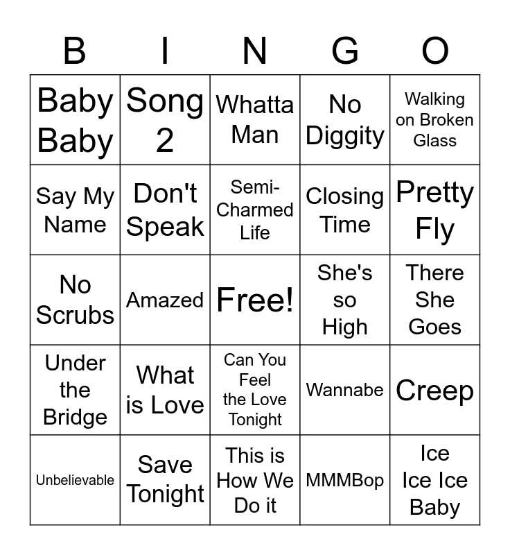 This bingo card has a free space and 48 words: Mr. Jones, Ice Ice Ice Baby, Livin' la Vida Loca, This is How We Do it, What is Love, Hold On, Song 2, Barbie Girl, Say My Name, My Name Is, Don't Speak, No Diggity, Creep, Wannabe, Everybody, Gangsta's Paradise, Semi-Charmed Life, She's so High, C'est La Vie, Walking on Broken Glass, Amazed, MMMBop, Baby Baby, Closing Time, U Can't Touch This, Pretty Fly, Unbelievable, Canned Heart, Can You Feel the Love Tonight, Under the Bridge, Kiss From a Rose, Walkin' on the Sun, Say You'll be There, Truly Madly Deeply, Save Tonight, I Knew I Loved You, Return of the Mack, There She Goes, I'm Too Sexy, Stop, I Want it that Way, All Star, Whatta Man, Santeria, No Scrubs, Just a Girl, Tearin' up my Heart and Shoop.