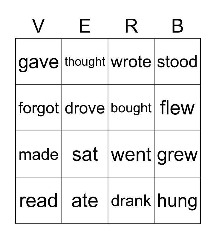 This bingo card has 19 words: went, saw, wrote, hung, grew, forgot, drank, gave, thought, made, sat, drove, bought, ate, read, froze, stood, flew and drew.