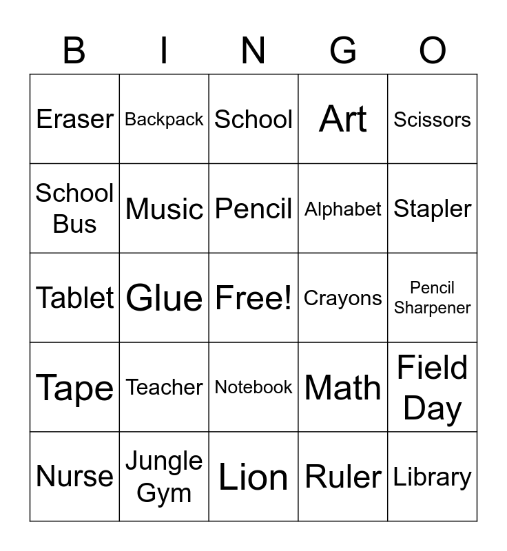 This bingo card has a free space and 48 words: PTO, Library, P.A.W.S., Lion, Teacher, Klein, Backpack, Social Studies, School Bus, Lunch, Music, Art, Field Day, Math, P.E. Teacher, Principal, Pencil, Crayons, Paper, Scissors, Glue, Ruler, Eraser, Alphabet, Numbers, Stapler, Nurse, Desk, Notebook, Tape, Clipboard, Whiteboard, Swings, Clock, Jungle Gym, Science, Award, Pencil Sharpener, Marker, Students, Paint, Read, School, Write, Tablet, Crossguard, Calendar and Walker.