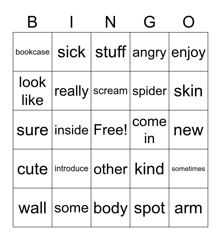 This bingo card has a free space and 29 words: wall, floor, inside, open, bookcase, stuff, really, introduce, come in, some, new, arm, body, spot, skin, sea, other, cute, enjoy, sure, kind, happy, spider, look like, angry, sick, sometimes, scream and feeling.