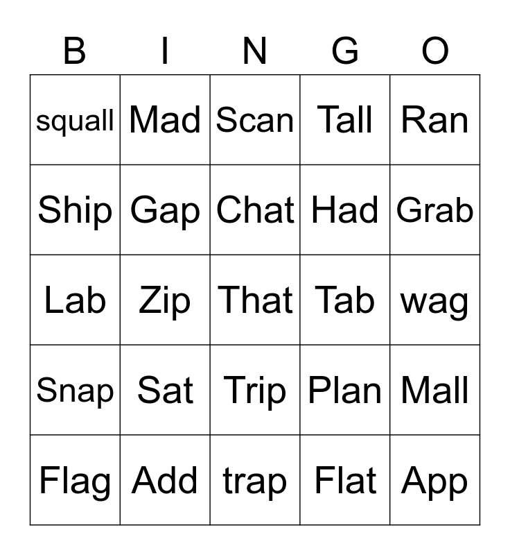 This bingo card has a free space and 24 words: Sat, Add, Chat, Flag, Ran, squall, Ship, Mad, Tab, Trip, Had, Lab, Plan, Mall, Gap, Flat, wag, Scan, Grab, Zip, App, Snap, Tall and trap.