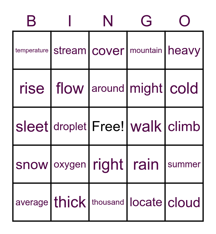 This bingo card has a free space and 76 words: percent, Earth, cover, ocean, cycle, heat, cause, evaporate, turn into, vapor, gas, air, around, rise, change into, droplet, together, cloud, bump, heavy, fall, sleet, flow, stream, mountain, river, repeat, million, imagine, water, cool, tiny, large, rain, cold, might, year, want, climb, locate, border, between, windy, blow, per, hour, average, temperature, drop, ground, stay, right, gear, reflect, cause, snow blindness, goggle, protect, frostbite, less, oxygen, prevent, altitude sickness, reach, succeed, winter, walk, highest, world, kilometer, summer, snow, thick, tank, thousand and try.