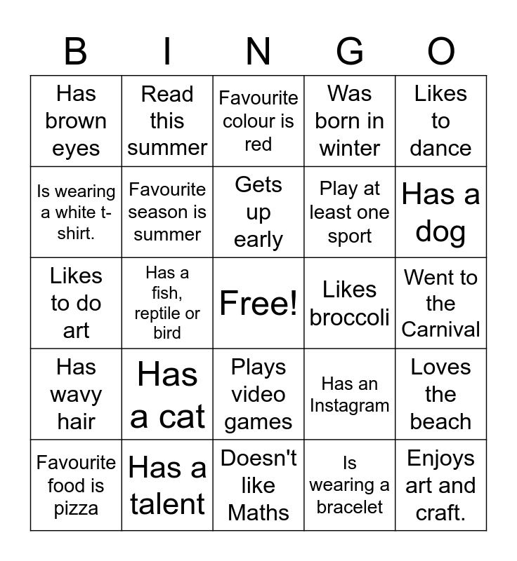 This bingo card has a free space and 25 words: Has a cat, Doesn't like Maths, Gets up early, Favourite food is pizza, Likes to dance, Has brown eyes, Is wearing a white t-shirt., Read this summer, Likes broccoli, Plays video games, Play at least one sport, Likes to do art, Has an Instagram, Loves the beach, Favourite season is summer, Has a brother, Went to the Carnival, Favourite colour is red, Has a dog, Has a fish, reptile or bird, Enjoys art and craft., Has a talent, Has wavy hair, Was born in winter and Is wearing a bracelet.