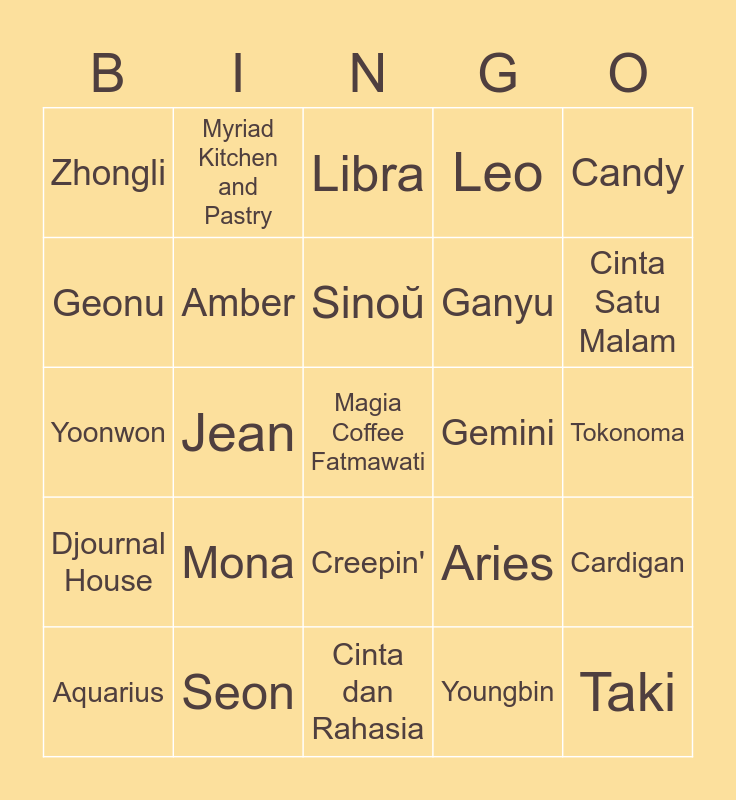 This bingo card has a free space and 24 words: Mona, Seon, Sinoŭ, Aquarius, Candy, Zhongli, Geonu, Myriad Kitchen and Pastry, Gemini, Creepin', Ganyu, Yoonwon, Aries, Cardigan, Amber, Youngbin, Tokonoma, Libra, Cinta Satu Malam, Jean, Taki, Djournal House, Leo and Cinta dan Rahasia.