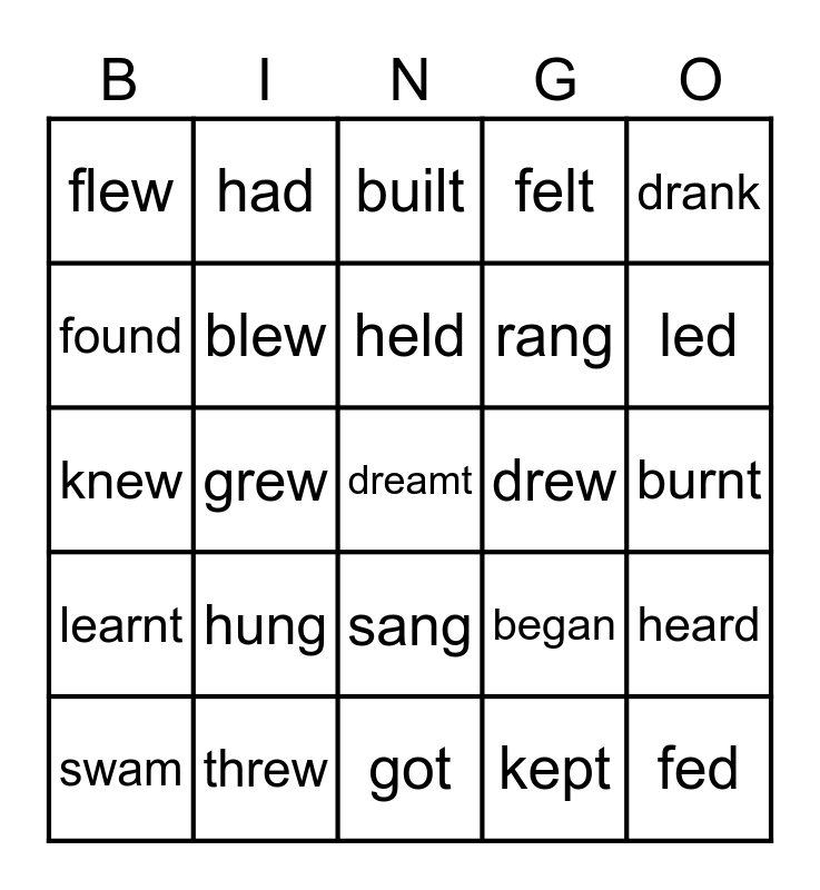 This bingo card has a free space and 24 words: hung, threw, held, swam, drank, flew, found, had, drew, sang, rang, knew, began, heard, blew, kept, burnt, built, led, grew, fed, learnt, felt and got.