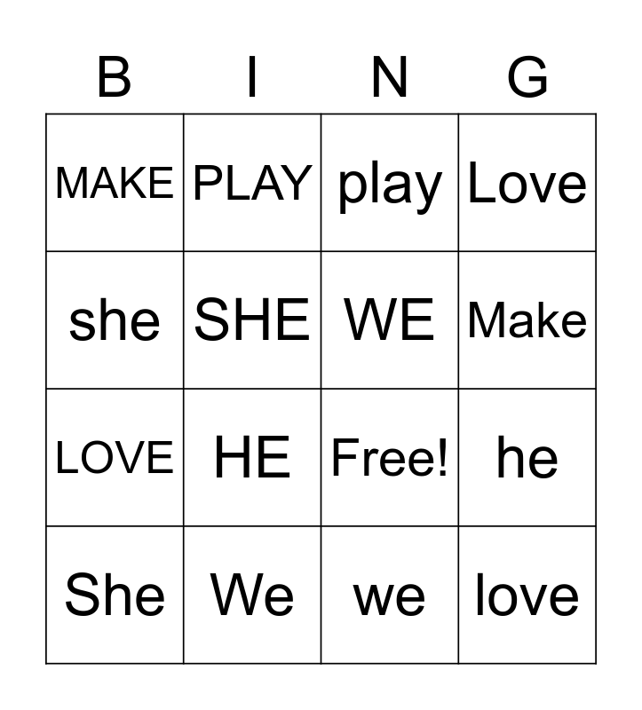 This bingo card has 19 words: Free!, make, play, love, he, she, we, MAKE, PLAY, LOVE, HE, SHE, WE, We, She, He, Love, Make and Play.
