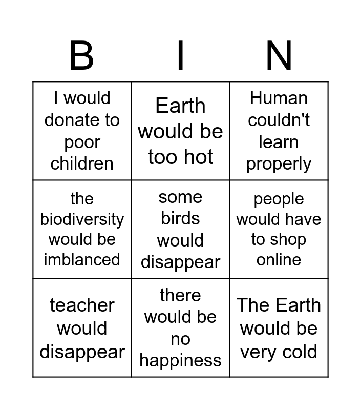This bingo card has a free space and 8 words: people would have to shop online, Human couldn't learn properly, Earth would be too hot, teacher would disappear, I would donate to poor children, The Earth would be very cold, the biodiversity would be imblanced and there would be no happiness.