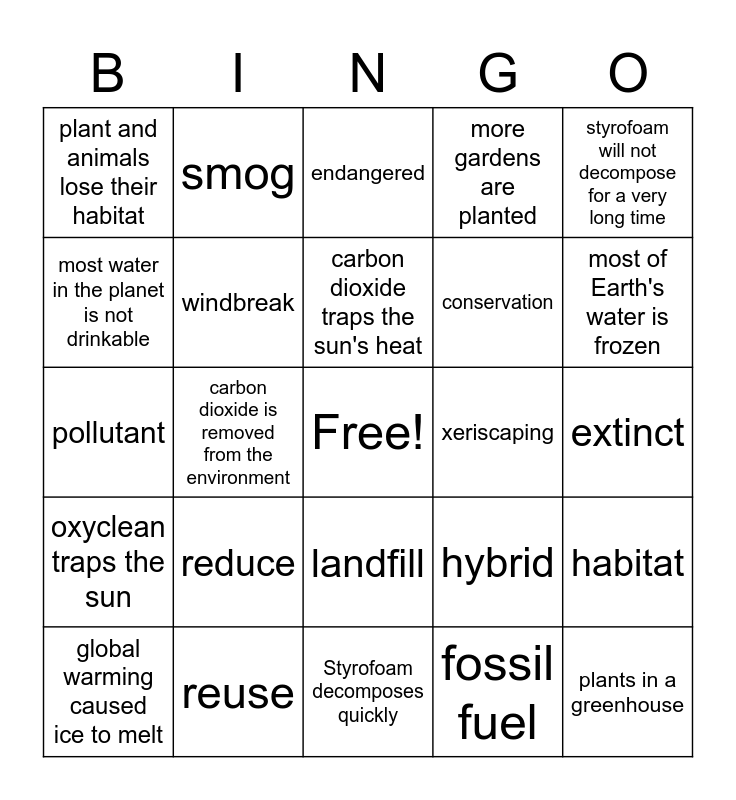 This bingo card has a free space and 24 words: reduce, reuse, carbon dioxide traps the sun's heat, global warming caused ice to melt, styrofoam will not decompose for a very long time, plant and animals lose their habitat, most water in the planet is not drinkable, smog, xeriscaping, landfill, conservation, pollutant, hybrid, habitat, windbreak, fossil fuel, extinct, endangered, most of Earth's water is frozen, carbon dioxide is removed from the environment, plants in a greenhouse, oxyclean traps the sun, more gardens are planted and Styrofoam decomposes quickly.