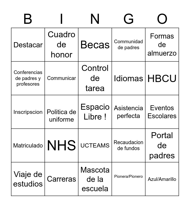 This bingo card has a free space and 24 words: NHS, Carreras, Control de tarea, Viaje de estudios, Formas de almuerzo, Destacar, Conferencias de padres y profesores, Cuadro de honor, Asistencia perfecta, UCTEAMS, Idiomas, Inscripscion, Recaudacion de fundos, Portal de padres, Communicar, Pionera/Pionero, Eventos Escolares, Becas, HBCU, Politica de uniforme, Azul/Amarillo, Matriculado, Communidad de padres and Mascota de la escuela.