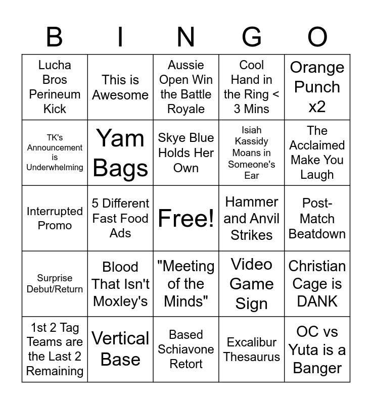 This bingo card has a free space and 24 words: Blood That Isn't Moxley's, Vertical Base, Skye Blue Holds Her Own, 1st 2 Tag Teams are the Last 2 Remaining, Orange Punch x2, Lucha Bros Perineum Kick, TK's Announcement is Underwhelming, This is Awesome, Hammer and Anvil Strikes, "Meeting of the Minds", Isiah Kassidy Moans in Someone's Ear, Interrupted Promo, Video Game Sign, Christian Cage is DANK, Yam Bags, Excalibur Thesaurus, Post-Match Beatdown, Aussie Open Win the Battle Royale, The Acclaimed Make You Laugh, 5 Different Fast Food Ads, OC vs Yuta is a Banger, Surprise Debut/Return, Cool Hand in the Ring < 3 Mins and Based Schiavone Retort.