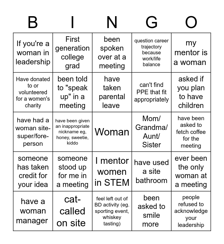 This bingo card has a free space and 24 words: someone stood up for me in a meeting, cat-called on site, have taken parental leave, have a woman manager, my mentor is a woman, If you're a woman in leadership, Have donated to or volunteered for a women's charity, First generation college grad, Mom/ Grandma/ Aunt/ Sister, I mentor women in STEM, can't find PPE that fit appropriately, have had a woman site-super/fore-person, have used a site bathroom, ever been the only woman at a meeting, been told to "speak up" in a meeting, been asked to smile more, have been asked to fetch coffee for the meeting, been spoken over at a meeting, asked if you plan to have children, have been given an inappropriate nickname eg, honey, sweetie, kiddo, people refused to acknowledge your leadership, someone has taken credit for your idea, question career trajectory because work/life balance and feel left out of BD activity (eg. sporting event, whiskey tasting).