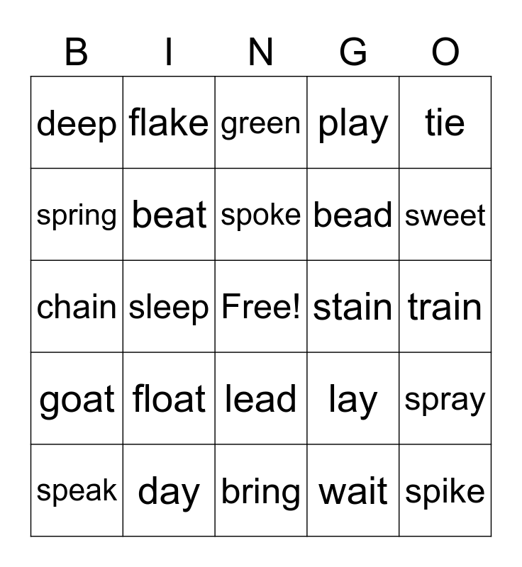 This bingo card has a free space and 24 words: float, day, spoke, speak, tie, deep, spring, flake, stain, lead, bead, chain, lay, spray, beat, wait, train, green, sweet, sleep, spike, goat, play and bring.