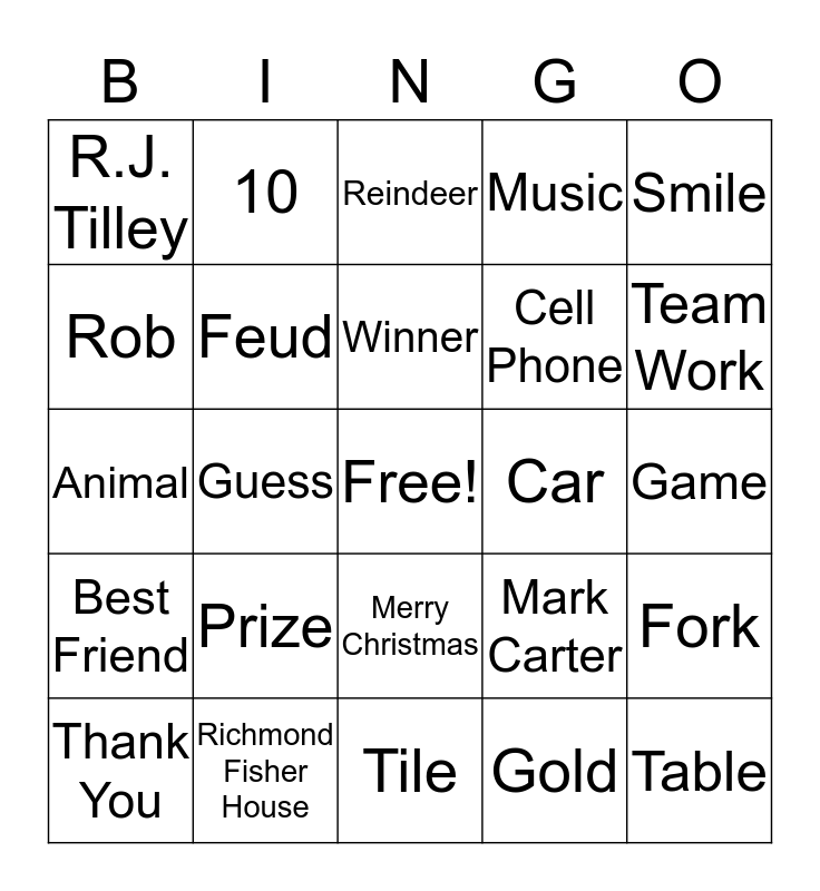 This bingo card has a free space and 24 words: Prize, Richmond Fisher House, Winner, Thank You, Smile, R.J. Tilley, Rob, 10, Car, Merry Christmas, Cell Phone, Animal, Mark Carter, Fork, Feud, Gold, Game, Reindeer, Team Work, Guess, Table, Best Friend, Music and Tile.