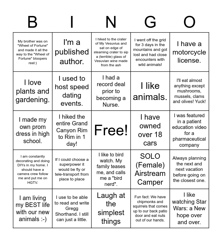 This bingo card has a free space and 38 words: I like dark music, I like working out, I am a part owner of a race horse., I used to host speed dating events., Always planning the next and next vacation before going on the closest one., If I could choose a superpower it would be fly or tele-transport from place to place, I had a record deal prior to becoming a Nurse., I own 30+ soccer scarves to professional soccer clubs, and the collection is growing., I have a motorcycle license., I like animals., I hiked the entire Grand Canyon Rim to Rim in 1 day!, I went off the grid for 3 days in the mountains and got lost and had close encounters with wild animals!, I like watching Star Wars: a New hope over and over., I was featured in a patient education video for a pharmaceutical company, I love plants and gardening., I am constantly decorating and doing DIYs in my home. I should have a camera crew follow me and put me on HGTV., I often have very lucid and colorful dreams., I hiked to the crater of My Vesuvius and sat on edge of steaming crater to sip a (terrible) glass of Vesuvian wine made from the ash, love the Ocean, I have owned over 18 cars, My brother was on "Wheel of Fortune" and made it all the way to the "Wheel of Fortune" bloopers reel:), I use to be able to read and write Gregg Shorthand. I still can just a little., I'll eat almost anything except mushrooms, mussels, clams and olives! Yuck!, I am living my BEST life with our new animals :-), I have traveled abroad for 3 months doing mission work in a 3rd world country-helping to build a school, volunteering in a hospital, participating in Bible study, visiting the sick., Laugh at the simplest things, Nothing makes me happier than my runs on the beach in the sand in the winter or in the water on hot summer days, a gentle breeze blowing, my mind at peace with the waves., Fun fact- Love MLB - Atlanta Braves fan, I love to read, I collect and love all things miniature!, I practice mindfulness, I like to bird watch. My family teases me, and calls me a "bird nerd"., Fun fact: We have chipmonks and squirrels that comes up to our back patio door and eat nuts out of our hands., I'm a published author., I lived in the South of France/Monaco one summer in between travel nursing with a group of nurses. Learned about French cuisine and other fun facts such as: Rose wine is made from red grape skins. I can make a mean steak frites and Coq au vi, SOLO (Female) Airstream Camper, I made my own prom dress in high school. and I enjoy traveling around my state/area on my motorcycle..