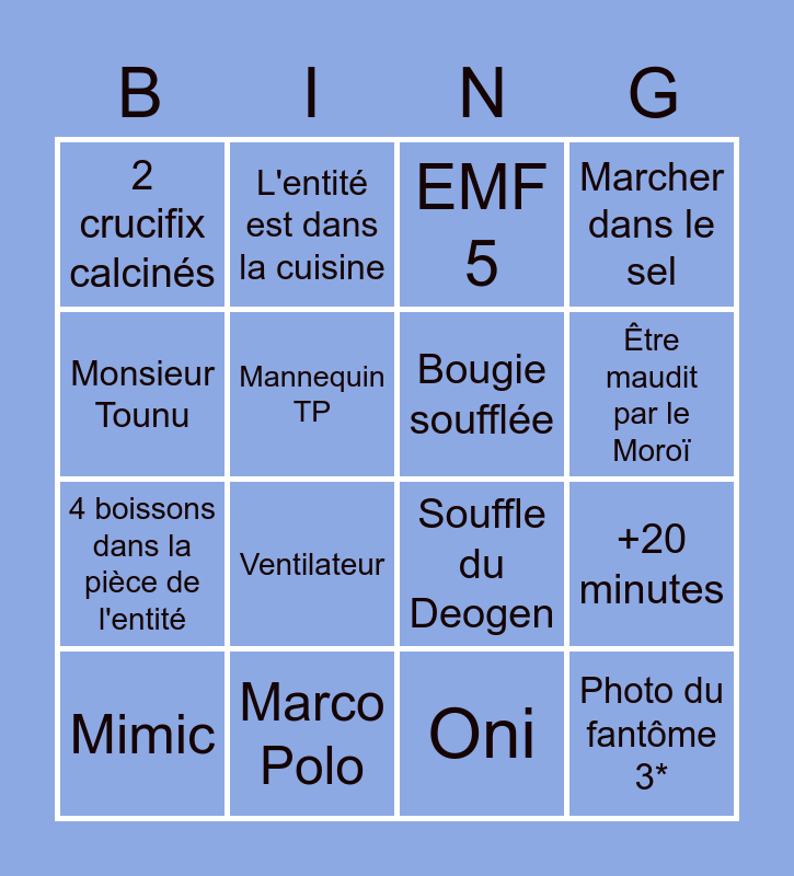 This bingo card has 101 words: Orage, Cri Banshee, Monsieur Tounu, Eau sale, Guitare, Lumière rouge, Sans Encens, 0%, Deogen, Looper l'entité, Colone vertébrale, Vieille connasse, Tous les objectifs, Tableau qui tombe, Crucifix brûlé, Cauchemars, Photo du fantôme 3*, Sans pilule, Démon, Provoquer une chasse maudite, Rire de la papuche, Objet de base, Sans lampe de poche, Banshee, Pas de camion, Ventilateur, Marcher dans le sel, Emprunte 6 doigts, Téléphone sonne/vibre, Être la seule survivante, L'entité est dans la cuisine, EMF 5, CaptainRin meurt, che3eze meurt, Shakra meurt, 50$ photos, Souffle du fantôme, Allumer le pentacle, Rocking Chair, Télévision, Klaxon, Coupure de courant, Ampoule pétée, Carte High priestess, Pleurs du fantôme, Mimic, Crâne, Cache-Cache, Bombe de peinture au sol, Neige, Carte du Pendu, Mannequin TP, Photo ratée, Jumeaux, L'entité est au sous-sol, Photo du fantôme 2*, Photo du fantôme 1*, Ombre, -10 minutes, Cadavre 3*, Bougie soufflée, Yurei, "Behind you", Spectre, Entité mineur, 4 boissons dans la pièce de l'entité, Douche, +20 minutes, Ghost name : Nancy, Allumer la boite à musique, Photo DOTS, Esprit, 2 crucifix calcinés, Goryo, Être maudit par le Moroï, Souffle du Deogen, Rampant, 70$ photos, Bill le boucher, Rire du fantôme, Os du pied, Chambre d'enfant, Marco Polo, Ordinateur, Micro-onde, Femme dans la cuisine, Oni, Onryo, Piano, Pas de juron, Game Solo, Marie-Jeanne, BONUS, Joe le clodo, Chant du fantôme, Os de merde, Brouillard, Papy, Aléatoire : Grande Map, Coup d'pute : activer l'objet maudit sans rien dire and Coup d'pute : voler un gage reussi d'un mate.