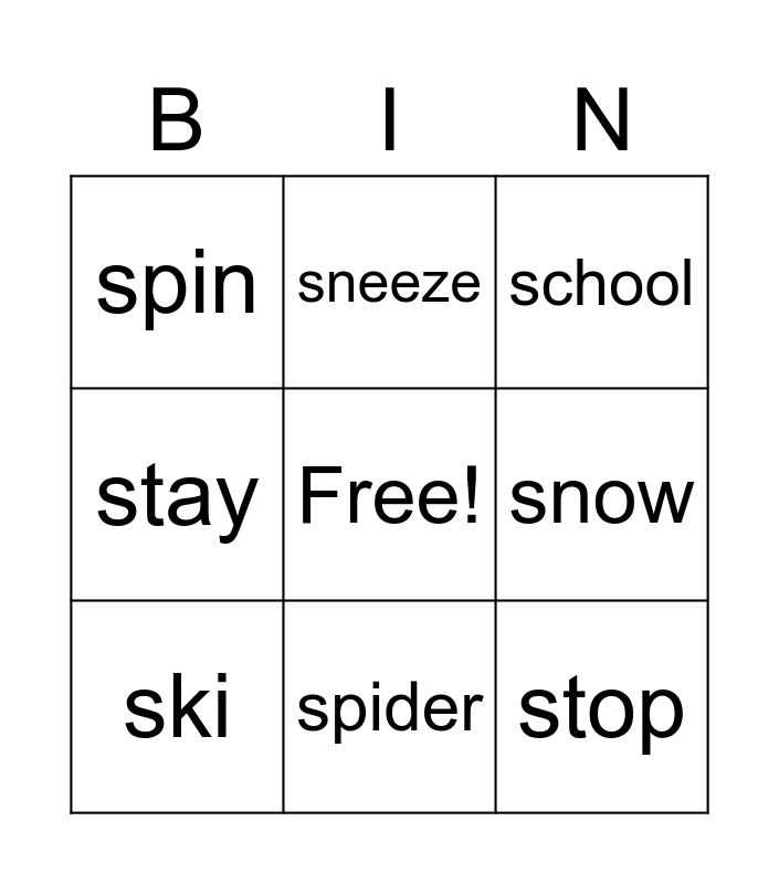 This bingo card has a free space and 10 words: spider, school, spin, stop, stay, ski, sneeze, skip, snow and sleep.