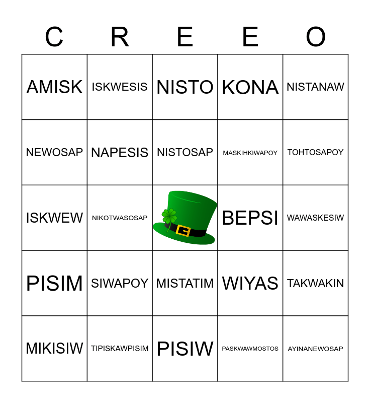 This bingo card has a free space and 76 words: PEYAK, NISO, NISTO, NEWO, NIYANAN, NIKOTWASIK, TEPAKOHP, AYINANEW, KEKAMITATAHT, MITATAHT, PEYAKOSAP, NISOSAP, NISTOSAP, NEWOSAP, NIYANANOSAP, NIKOTWASOSAP, TEPAKOHPOSAP, AYINANEWOSAP, KEKAMITATAHTOSAP, NISTANAW, NAPEW, ISKWEW, NAPESIS, ISKWESIS, KONA, NIPIY, API, NAMOYA, EHA, ANOHC, WAPAHKI, OTAKOSIHK, ASKIPWAW, WIYAS, TOHTOSAPOY, MASKIHKIWAPOY, PIHKATEWAPOY, PAHKWESIKAN, WAWASKESIW, PASKWAWMOSTOS, MAKWA, ANKWACAS, MAHKESIS, WAPOS, MAHIHKAN, MASKWA, MIKISIW, AMISK, APSIMOSOS, OHO, MOSWA, MISTATIM, ATIM, MINOS, KINOSEW, KAKWA, SIKAK, MOSTOS, PIYESIS, APAKOSIS, SIWAPOY, MICIWIN, PIPON, NIPIN, PISIW, AMO, BEPSI, KINEPIK, AHASIW, APIHTAWIKOSISAN, TAKWAKIN, PISIM, TIPISKAWPISIM, NEHIYAWEWIN, PISIW and AMO.