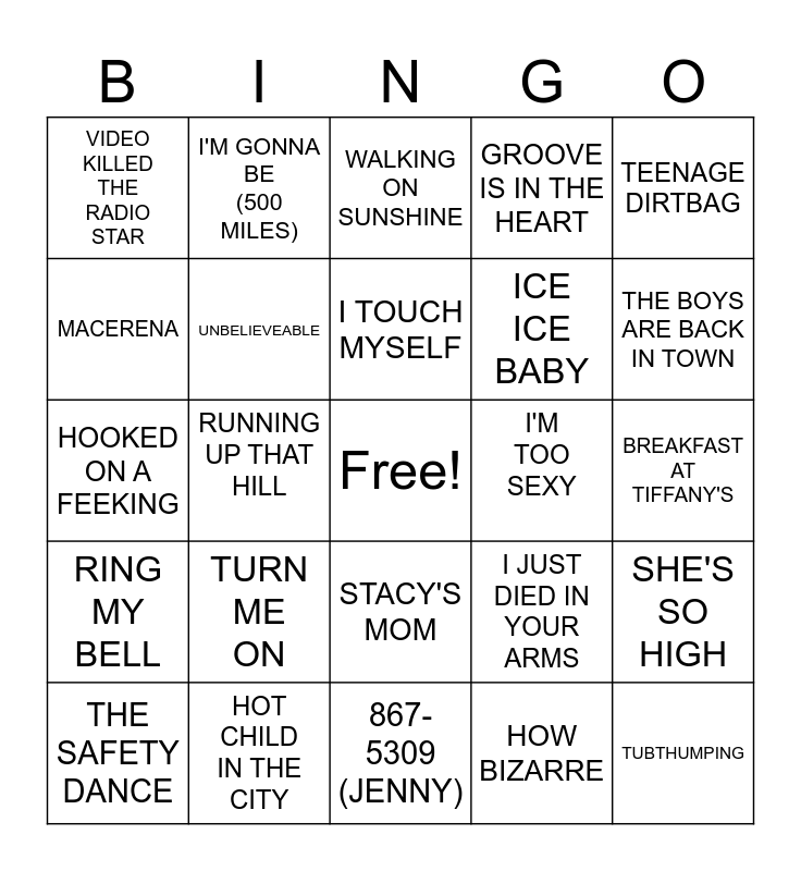 This bingo card has a free space and 31 words: 867-5309 (JENNY), ABSOLUTELY (STORY OF A GIRL), RUNNING UP THAT HILL, WALKING IN MEMPHIS, VIDEO KILLED THE RADIO STAR, WALKING ON SUNSHINE, UNBELIEVEABLE, I JUST DIED IN YOUR ARMS, I'M TOO SEXY, HOW BIZARRE, BREAKFAST AT TIFFANY'S, TUBTHUMPING, PLAY THAT FUNKY MUSIC, THE REASON, THE BOYS ARE BACK IN TOWN, IT'S RAINING MEN, SHE'S SO HIGH, TURN ME ON, RING MY BELL, STACY'S MOM, TEENAGE DIRTBAG, TORN, THE SAFETY DANCE, I'M GONNA BE (500 MILES), ICE ICE BABY, MACERENA, GROOVE IS IN THE HEART, HOOKED ON A FEEKING, HOT CHILD IN THE CITY, I TOUCH MYSELF and WHAT IS LOVE.