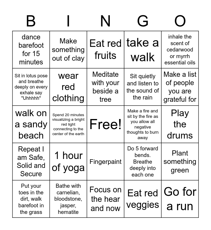 This bingo card has a free space and 24 words: 1 hour of yoga, Bathe with carnelian, bloodstone, jasper, hematite, Meditate with your beside a tree, Put your toes in the dirt, walk barefoot in the grass, inhale the scent of cedarwood or myrrh essential oils, dance barefoot for 15 minutes, Sit in lotus pose and breathe deeply on every exhale say "Uhhhhh", Make something out of clay, Make a fire and sit by the fire as you allow all negative thoughts to burn away, Fingerpaint, Sit quietly and listen to the sound of the rain, walk on a sandy beach, Do 5 forward bends. Breathe deeply into each one, Plant something green, wear red clothing, Eat red veggies, Play the drums, Eat red fruits, Make a list of people you are grateful for, Spend 20 minutes visualizing a bright red light connecting to the center of the earth, Go for a run, Repeat I am Safe, Solid and Secure, take a walk and Focus on the hear and now.