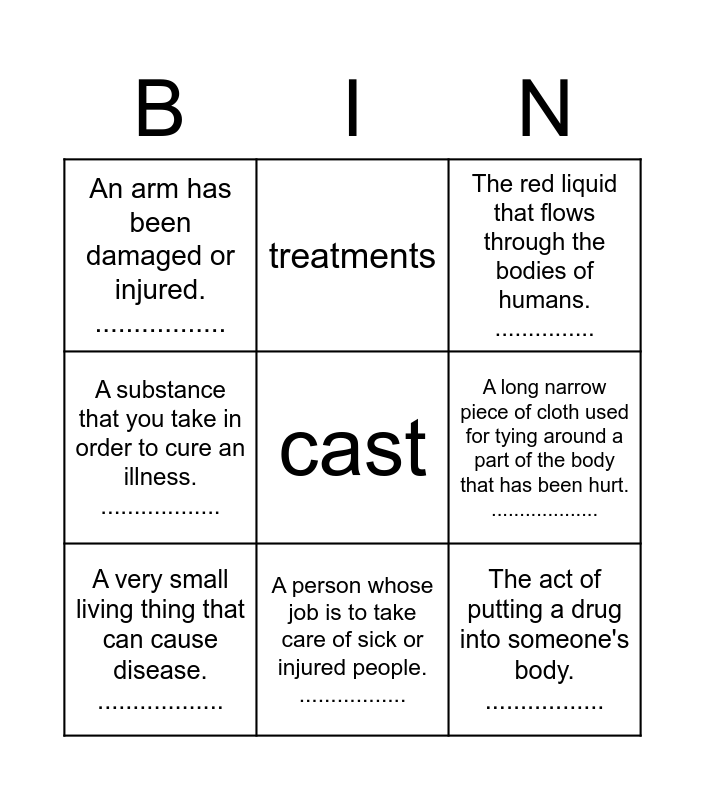 This bingo card has a free space and 8 words: A long narrow piece of cloth used for tying around a part of the body that has been hurt. ..................., The red liquid that flows through the bodies of humans. ..............., treatments, A very small living thing that can cause disease. .................., An arm has been damaged or injured. ................., The act of putting a drug into someone's body. ................., A substance that you take in order to cure an illness. .................. and A person whose job is to take care of sick or injured people. ..................
