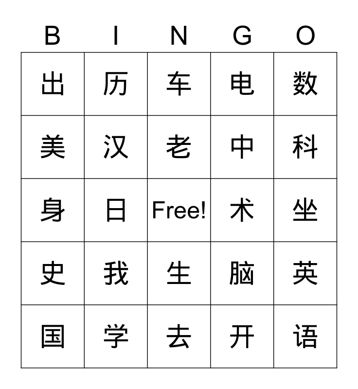 This bingo card has a free space and 24 words: 我, 学, 老, 国, 数, 出, 美, 历, 术, 生, 中, 身, 脑, 英, 汉, 开, 坐, 车, 科, 日, 语, 史, 电 and 去.