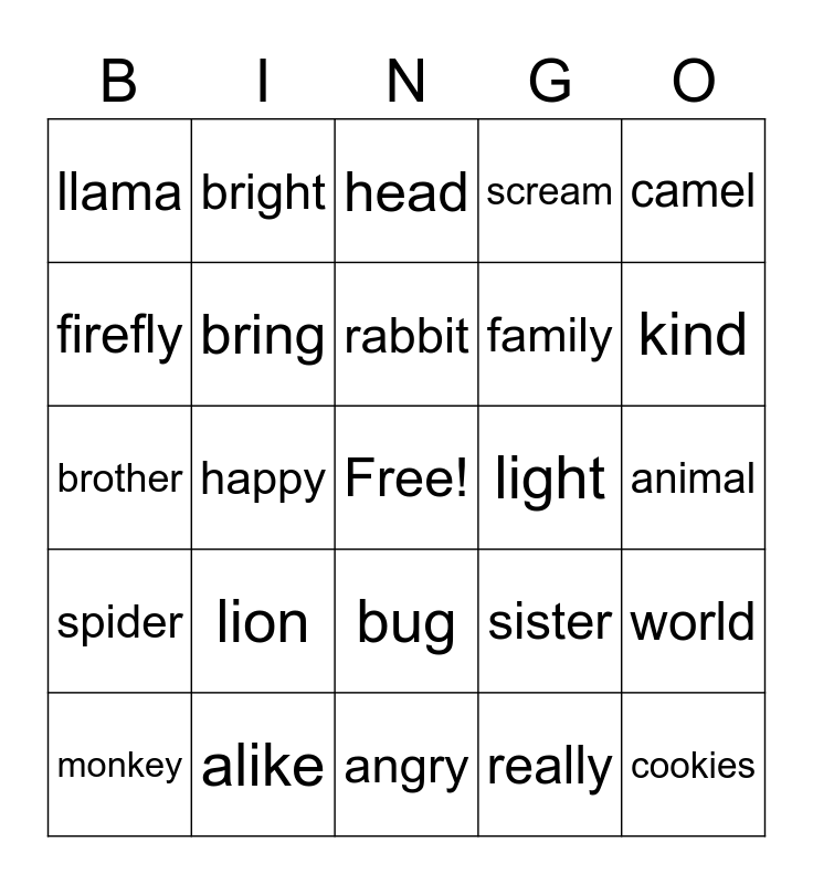 This bingo card has a free space and 24 words: lion, alike, rabbit, monkey, camel, llama, firefly, bright, light, bug, family, brother, sister, world, bring, really, animal, head, kind, happy, cookies, spider, scream and angry.