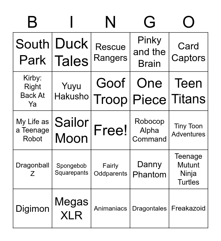 This bingo card has a free space and 33 words: Sonic Underground, Family Guy, Sailor Moon, Dragonball (original), Dragonball Z, Yuyu Hakusho, Card Captors, Digimon, Duck Tales, Tale Spin, Goof Troop, Rescue Rangers, Hamtaro, Speed Racer, Robocop Alpha Command, Teen Titans, Megas XLR, My Life as a Teenage Robot, Spongebob Squarepants, Danny Phantom, Fairly Oddparents, The Flintstones, South Park, Tiny Toon Adventures, Animaniacs, Freakazoid, Pinky and the Brain, One Piece, Kirby: Right Back At Ya, Teenage Mutunt Ninja Turtles, Authur, Dragontales and Ghostbusters.