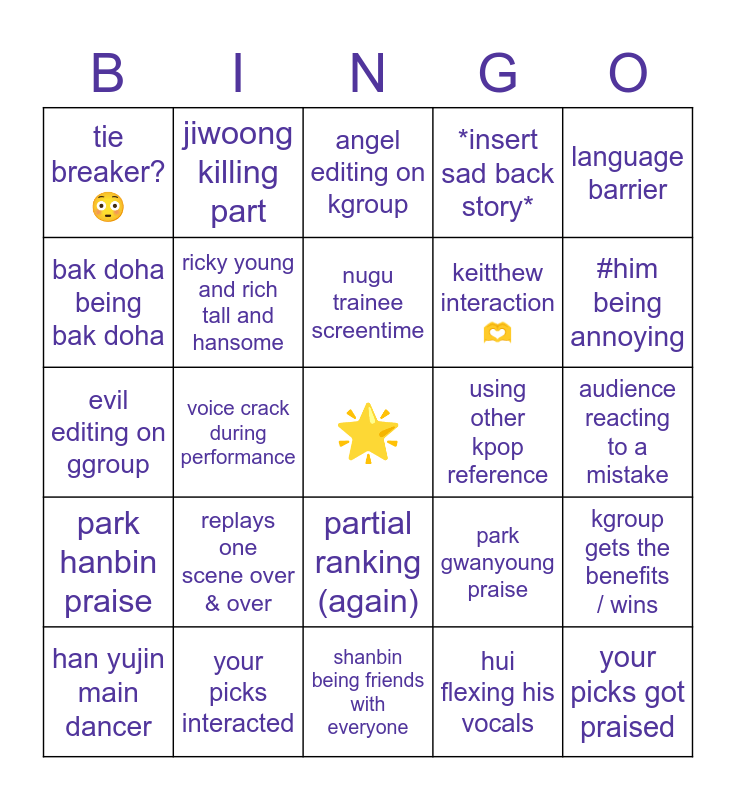 This bingo card has a free space and 24 words: han yujin main dancer, replays one scene over & over, nugu trainee screentime, hui flexing his vocals, language barrier, tie breaker? 😳, jiwoong killing part, angel editing on kgroup, using other kpop reference, audience reacting to a mistake, evil editing on ggroup, ricky young and rich tall and hansome, park gwanyoung praise, kgroup gets the benefits / wins, bak doha being bak doha, your picks interacted, shanbin being friends with everyone, *insert sad back story*, #him being annoying, park hanbin praise, voice crack during performance, partial ranking (again), keitthew interaction 🫶 and your picks got praised.