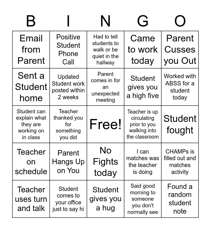 This bingo card has a free space and 25 words: Parent Hangs Up on You, Student gives you a hug, Parent comes in for an unexpected meeting, Teacher uses turn and talk, Parent Cusses you Out, Email from Parent, Sent a Student home, Positive Student Phone Call, Teacher is up circulating prior to you walking into the classroom, No Fights today, Student gives you a high five, Student can explain what they are working on in class, I can matches was the teacher is doing, CHAMPs is filled out and matches activity, Updated Student work posted within 2 weeks, Only NHA curriculum is being used, Student fought, Had to tell students to walk or be quiet in the hallway, Worked with ABSS for a student today, Teacher thanked you for something you did, Found a random student note, Student comes to your office just to say hi, Teacher on schedule, Came to work today and Said good morning to someone you don't normally see.