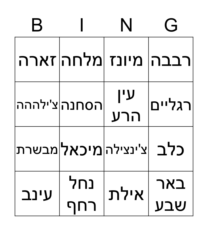 This bingo card has a free space and 22 words: נחל רחף, מנגל דגים, מלחה, הגדר, הסחנה, עין הרע, זארה, מיונז, באר שבע, חברים (friends), מבשרת, רבבה, לרנררר, גםם/לאא/ שת.., אילת, אדישי, כלב, עינב, מיכאל, צ'ילההה, רגליים and הנדסה.