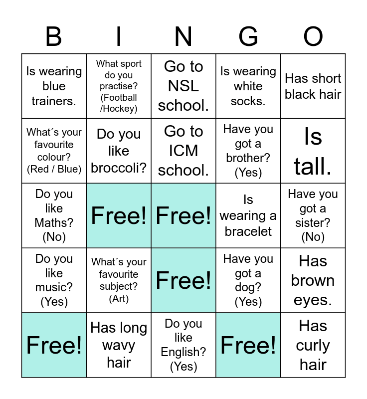 This bingo card has a free space and 24 words: What´s your favourite subject? (Art), Has long wavy hair, Go to ICM school., Free!, Has short black hair, Is wearing blue trainers., What´s your favourite colour? (Red / Blue), What sport do you practise? (Football /Hockey), Is wearing a bracelet, Free!, Have you got a brother? (Yes), Do you like Maths? (No), Have you got a dog? (Yes), Has brown eyes., Do you like broccoli?, Free!, Have you got a sister? (No), Go to NSL school., Is tall., Free!, Has curly hair, Do you like music? (Yes), Is wearing white socks. and Do you like English? (Yes).