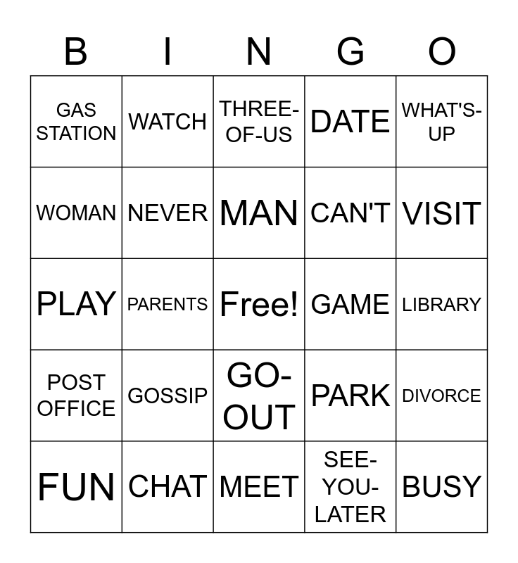 This bingo card has a free space and 43 words: BROKE, BUSY, FRIEND, FUN, GROUP, SEE-YOU-LATER, THREE-OF-US, TWO-OF-US, WHAT'S-UP, CHAT, DATE, GAME, GO-OUT, GOSSIP, HANG-OUT, MEET, PARTY, PLAY, TALK, VISIT, WATCH, BANK, COLLEGE, GAS STATION, GROCERY STORE, LIBRARY, MOVIE THEATER, SCHOOL, PARK, POST OFFICE, CHILDREN, DIVORCE, MARRY, PARENTS, PEOPLE, NIECE, NEPHEW, MAN, WOMAN, CAN'T, NOT, NEVER and NONE.
