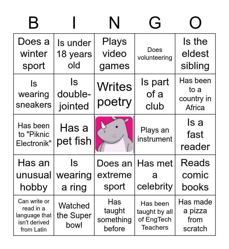 This bingo card has a free space and 24 words: Is wearing a ring, Watched the Super bowl, Writes poetry, Can write or read in a language that isn't derived from Latin, Is the eldest sibling, Does a winter sport, Is wearing sneakers, Is under 18 years old, Plays an instrument, Does an extreme sport, Is part of a club, Has been to "Piknic Electronik", Has met a celebrity, Reads comic books, Is double-jointed, Has been taught by all of EngTech Teachers, Is a fast reader, Plays video games, Has been to a country in Africa, Has a pet fish, Has made a pizza from scratch, Has an unusual hobby, Does volunteering and Has taught something before.