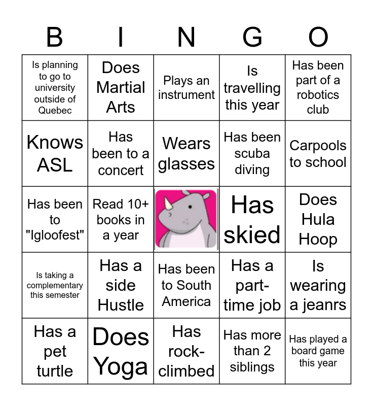 This bingo card has a free space and 24 words: Has a side Hustle, Does Yoga, Wears glasses, Has a pet turtle, Has been part of a robotics club, Is planning to go to university outside of Quebec, Knows ASL, Does Martial Arts, Has skied, Has been to South America, Has been scuba diving, Has been to "Igloofest", Has a part-time job, Is wearing a jeanrs, Has been to a concert, Has more than 2 siblings, Does Hula Hoop, Plays an instrument, Carpools to school, Read 10+ books in a year, Has played a board game this year, Is taking a complementary this semester, Is travelling this year and Has rock-climbed.