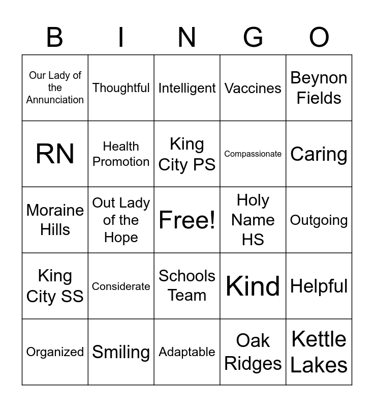 This bingo card has a free space and 35 words: Travel, Wellness, Mental Health, Health Promotion, Schools Team, Vaccines, RN, Macleod’s Landing, King City PS, Father Fredrick McGinn, Moraine Hills, Beynon Fields, Bond Lake HS, Windham Ridge, Our Lady of the Annunciation, Holy Name HS, Oak Ridges, Out Lady of the Hope, King City SS, Kettle Lakes, Kind, Organized, Helpful, Smiling, Intelligent, Caring, Supportive, Awesome, Compassionate, Outgoing, Friendly, Adaptable, Considerate, Thoughtful and Capable.