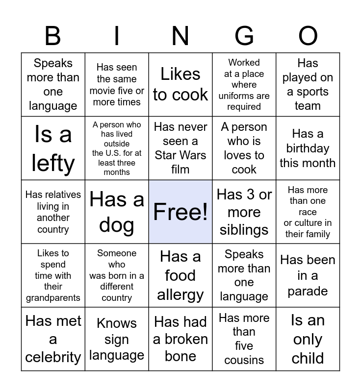This bingo card has a free space and 24 words: Someone who was born in a different country, Knows sign language, Has never seen a Star Wars film, Has met a celebrity, Has played on a sports team, Speaks more than one language, Is a lefty, Has seen the same movie five or more times, Has 3 or more siblings, Has a food allergy, A person who is loves to cook, Has relatives living in another country, Speaks more than one language, Has been in a parade, A person who has lived outside the U.S. for at least three months, Has more than five cousins, Has more than one race or culture in their family, Likes to cook, Has a birthday this month, Has a dog, Is an only child, Likes to spend time with their grandparents, Worked at a place where uniforms are required and Has had a broken bone.