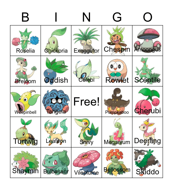 This bingo card has 24 images, a free space and 24 words: Leafeon, Bulbasaur, Celebi, Shaymin, Amoongus, Roselia, Breloom, Chickoria, Pumpkaboo, Snivy, Rowlet, Weepinbell, Meganium, Deerling, Oddish, Bellossom, Cherubi, Exeggutor, Sceptile, Tangela, Skiddo, Turtwig, Chespin and Vileplume.