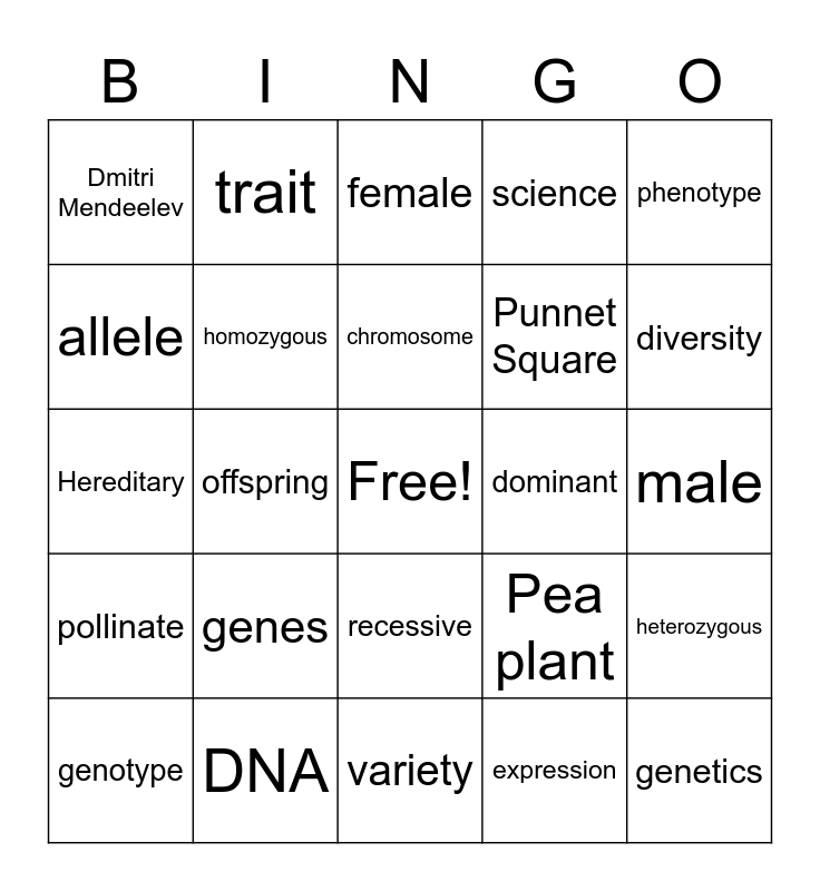 This bingo card has a free space and 24 words: genes, DNA, chromosome, genotype, phenotype, Dmitri Mendeelev, allele, trait, dominant, recessive, Punnet Square, Hereditary, Pea plant, heterozygous, homozygous, expression, male, female, diversity, offspring, genetics, pollinate, science and variety.