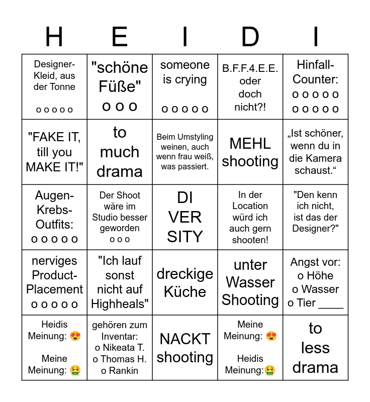 This bingo card has a free space and 24 words: "Ich lauf sonst nicht auf Highheals", gehören zum Inventar: o Nikeata T. o Thomas H. o Rankin, Beim Umstyling weinen, auch wenn frau weiß, was passiert., Heidis Meinung: 😍 Meine Meinung: 🤮, Hinfall-Counter: o o o o o o o o o o, Designer-Kleid, aus der Tonne o o o o o, "FAKE IT, till you MAKE IT!", "schöne Füße" o o o, In der Location würd ich auch gern shooten!, dreckige Küche, MEHL shooting, Augen-Krebs-Outfits: o o o o o, unter Wasser Shooting, Angst vor: o Höhe o Wasser o Tier ____, to much drama, Meine Meinung: 😍 Heidis Meinung:🤮, "Den kenn ich nicht, ist das der Designer?", someone is crying o o o o o, „Ist schöner, wenn du in die Kamera schaust.“, Der Shoot wäre im Studio besser geworden o o o, to less drama, nerviges Product-Placement o o o o o, B.F.F.4.E.E. oder doch nicht?! and NACKT shooting.