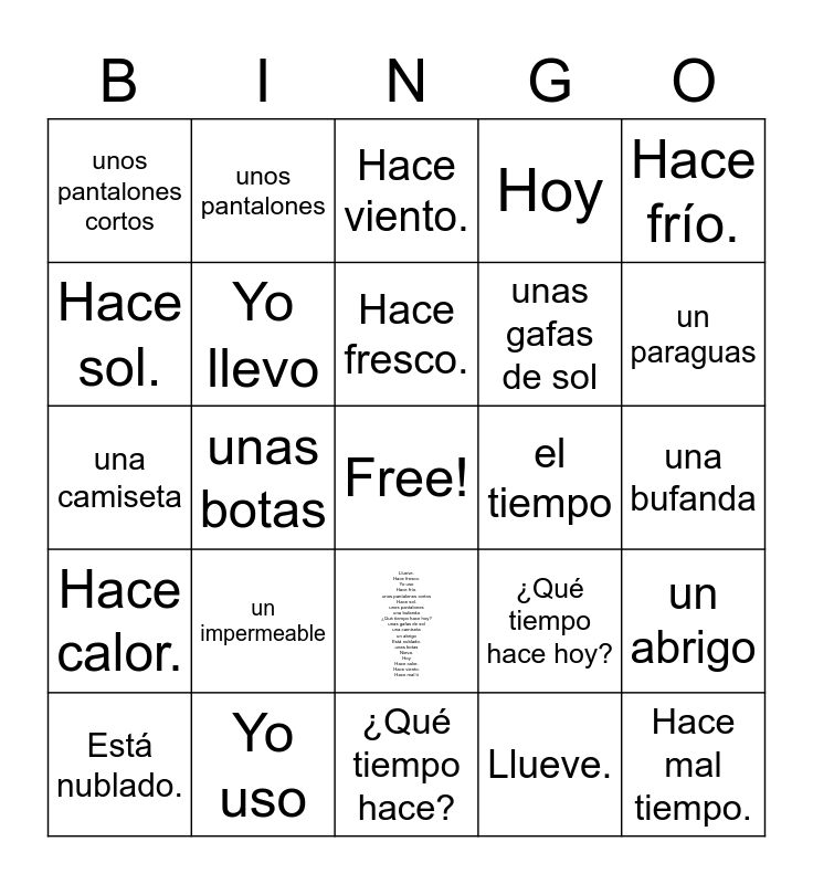 This bingo card has a free space and 26 words: Llueve. Hace fresco. Yo uso Hace frío. unos pantalones cortos Hace sol. unos pantalones una bufanda ¿Qué tiempo hace hoy? unas gafas de sol una camiseta un abrigo Está nublado. unas botas Nieva. Hoy Hace calor. Hace viento. Hace mal ti, Llueve., Hace fresco., Yo uso, Hace frío., unos pantalones cortos, Hace sol., unos pantalones, una bufanda, ¿Qué tiempo hace hoy?, unas gafas de sol, una camiseta, un abrigo, Está nublado., unas botas, Nieva., Hoy, Hace calor., Hace viento., Hace mal tiempo., un paraguas, ¿Qué tiempo hace?, el tiempo, un impermeable, Yo llevo and Hace buen tiempo..
