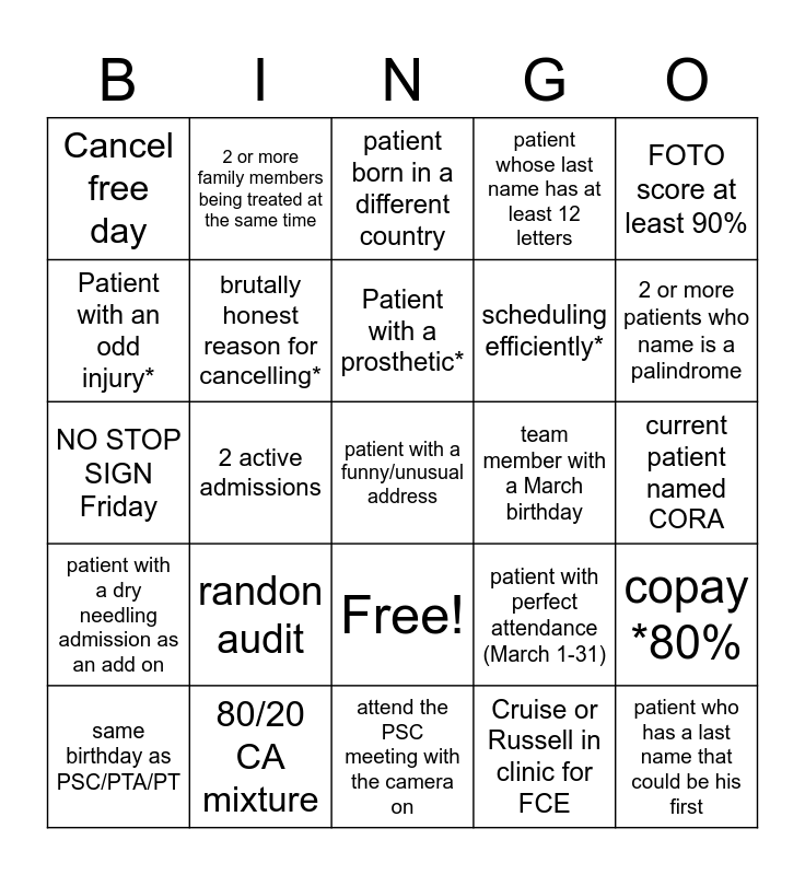 This bingo card has 26 words: Free!, Cruise or Russell in clinic for FCE, Patient with a prosthetic*, 80/20 CA mixture, FOTO score at least 90%, Cancel free day, Patient with an odd injury*, 2 or more family members being treated at the same time, current patient named CORA, patient with perfect attendance (March 1-31), scheduling efficiently*, NO STOP SIGN Friday, copay *80%, same birthday as PSC/PTA/PT, 2 active admissions, James' challenge, patient whose last name has at least 12 letters, patient with a dry needling admission as an add on, patient born in a different country, patient with a funny/unusual address, 2 or more patients who name is a palindrome, attend the PSC meeting with the camera on, team member with a March birthday, randon audit, brutally honest reason for cancelling* and patient who has a last name that could be his first.