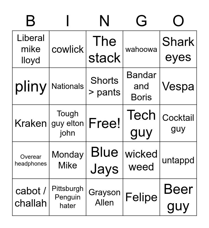 This bingo card has a free space and 41 words: Commies, Kraken, Texans, Nationals, Pittsburgh Penguin hater, Blue Jays, Shorts > pants, Lloyd’s new grill, Shark eyes, Overear headphones, Tough guy elton john, wahoowa, Beer guy, Cocktail guy, Tech guy, Monday Mike, The portfolio, Liberal mike lloyd, golf, The stack, untappd, Tech Club, Grayson Allen, Bandar and Boris, Harjot, Liam, Felipe, mj, Vespa, Walkabouts, denim you can only wash in the ocean, cowlick, cabot / challah, sh*thead, wicked weed, pliny, Mersky (the hamster), Laura Weiss, gumgums, "that's crazy" and "sure buddy".