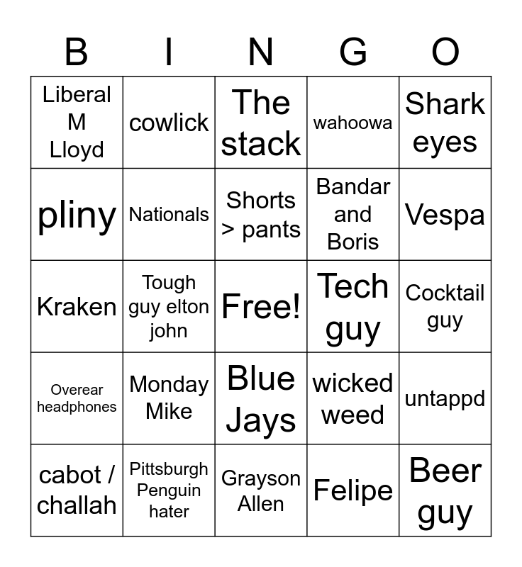 This bingo card has a free space and 41 words: Commies, Kraken, Texans, Nationals, Pittsburgh Penguin hater, Blue Jays, Shorts > pants, Lloyd’s new grill, Shark eyes, Overear headphones, Tough guy elton john, wahoowa, Beer guy, Cocktail guy, Tech guy, Monday Mike, The portfolio, Liberal M Lloyd, golf, The stack, untappd, Tech Club, Grayson Allen, Bandar and Boris, Harry, Liam, Felipe, mj, Vespa, Walkabouts, denim you can only wash in the ocean, cowlick, cabot / challah, sh*thead, wicked weed, pliny, Mersky (the hamster), Laura, gumgums, "that's crazy" and "sure buddy".